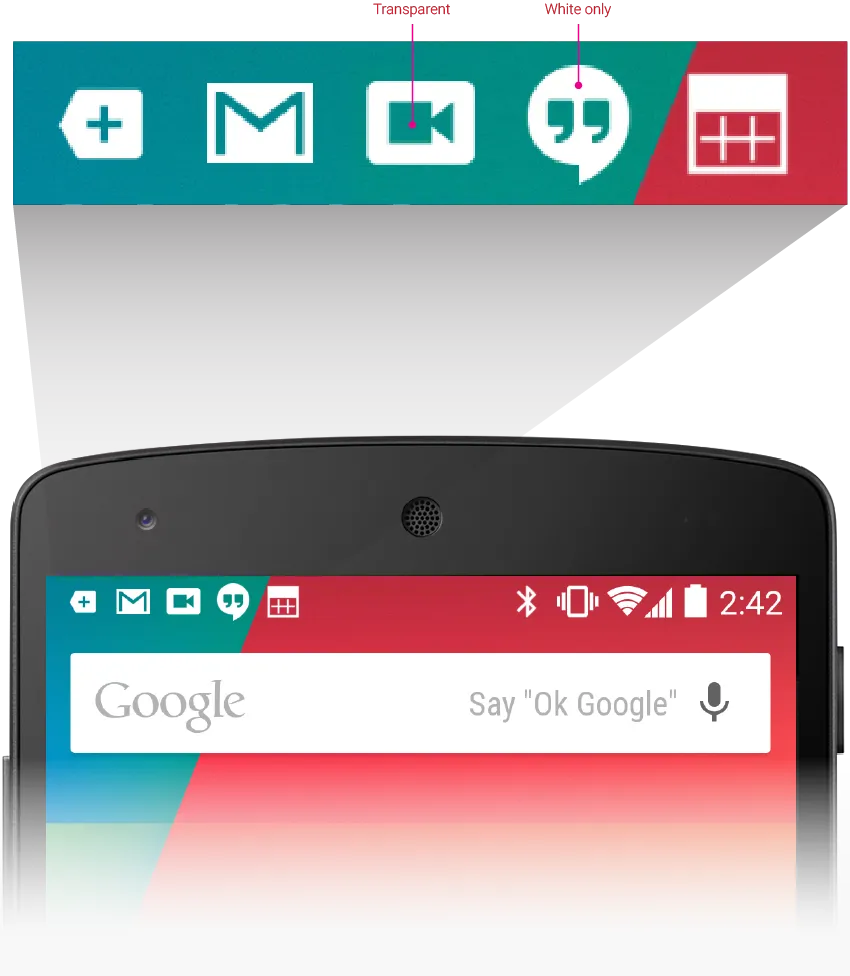 Don’t Use color to distinguish your app from others. Notification icons should only be a white-on-transparent background image. 简单的说就是 5.0 后 Android 官方建议不要为通知的图标添加任何额外的透明度,渐变色,不要企图用颜色将通知图标与其他应用,比如系统应用,应用的通知图标只能是在透明的背景上有白色的图案。 至于原因,文档并没有细说,只是提到 5.0 系统将会在底层处理图标,想知怎么处理的可以参考 Android SDK API level 21 后的 Notificaiton 源码,里面写的较详细。![]()