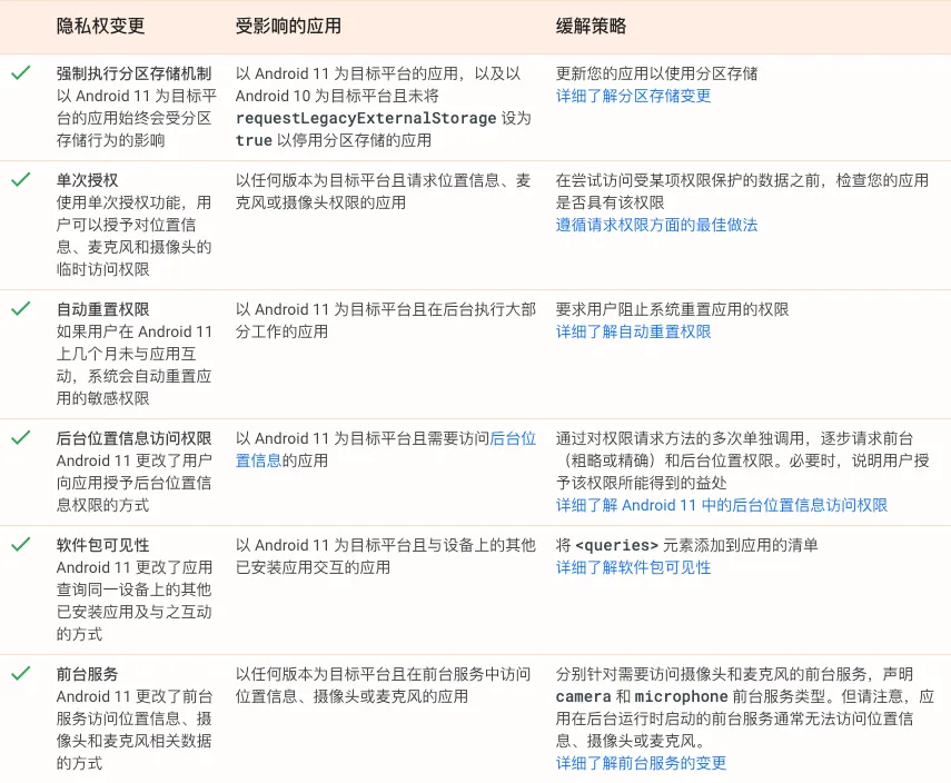 这些变化,影响所有的应用,不管你的应用的 targetSdkVersion 是多少,只要是运行在 Android 11 上都会影响,应该格外的关注: