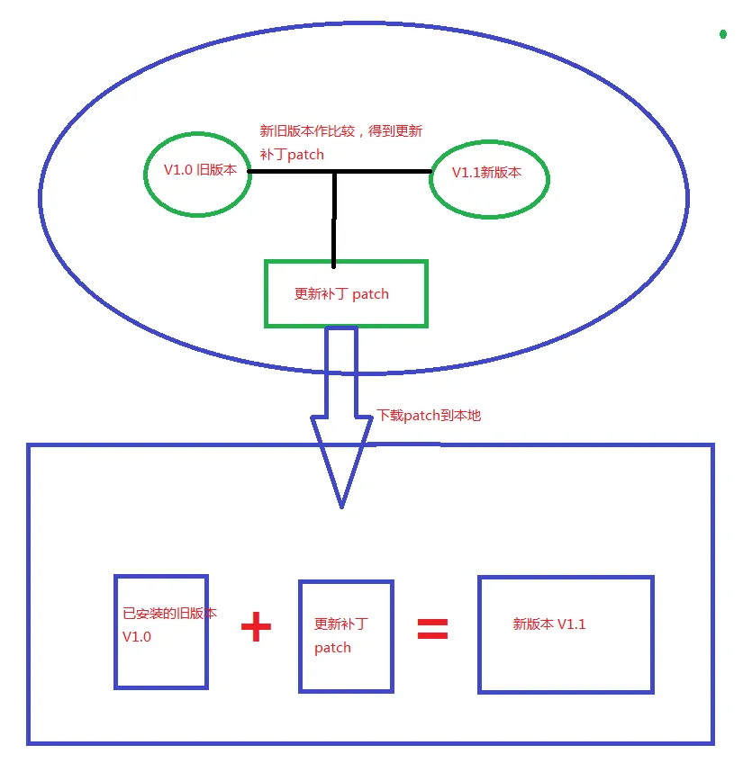 增量更新的原理非常简单,简单的说就是 通过某种算法找出新版本和旧版本不一样的地方(这个过程也叫做差分,某种。。别问我是那种 因为我也不知道。。),然后将不一样的地方抽取出来形成所谓的更新补丁(patch)。客户端在检测到更新的时候,只需要下载差分包到本地,然后将差分包合并至本地的安装包,形成新版本的安装包,文件校验通过后再执行安装即可。本地的安装包通过提取当前已安装应用的 apk 得到。
