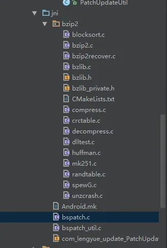 将 bzip 中除了.c .h 外的文件全部删除,将整个文件夹复制到 AS 的 JNI 目录,同时将 bsdiff 的源码复制到 JNI 目录,将 bsdiff 的代码打开将 main 方法改成 updatePatch 目录结构应该是这样的: