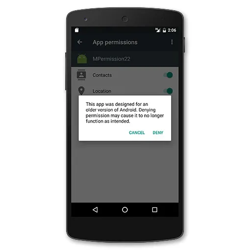 这个新的运行时权限仅当我们设置 targetSdkVersion to 23(这意味着你已经在 23 上测试通过了)才起作用,当然还要是 M 系统的手机。app 在 6.0 之前的设备依然使用旧的权限系统。 ####已经发布了的 app 会发生什么 新运行时权限可能已经让你开始恐慌了。“hey,伙计!我三年前发布的 app 可咋整呢。如果他被装到 android 6.0 上,我的 app 会崩溃吗?!?”