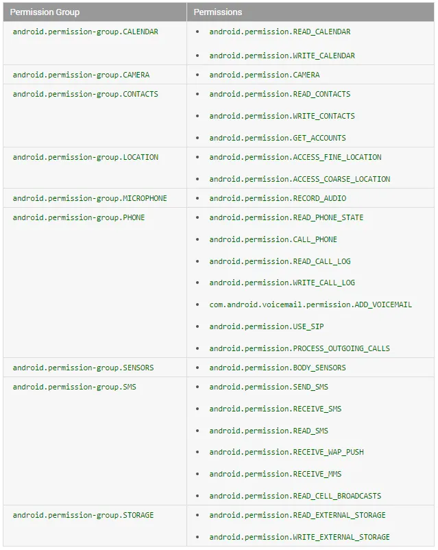 同一组的任何一个权限被授权了,其他权限也自动被授权。例如,一旦 WRITE_CONTACTS 被授权了,app 也有 READ_CONTACTS 和 GET_ACCOUNTS 了。