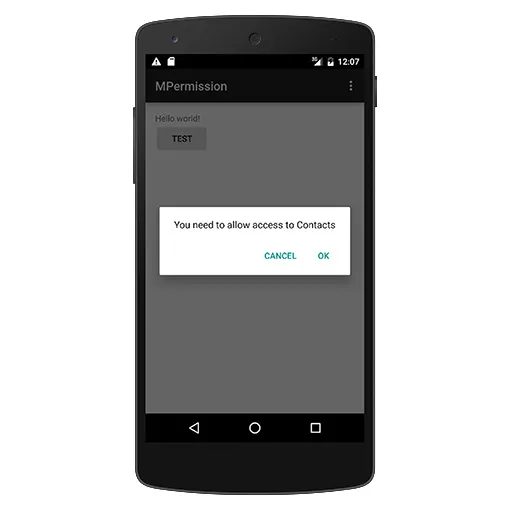 }如果已有权限,insertDummyContact() 会执行。否则,requestPermissions 被执行来弹出请求授权对话框,如下: