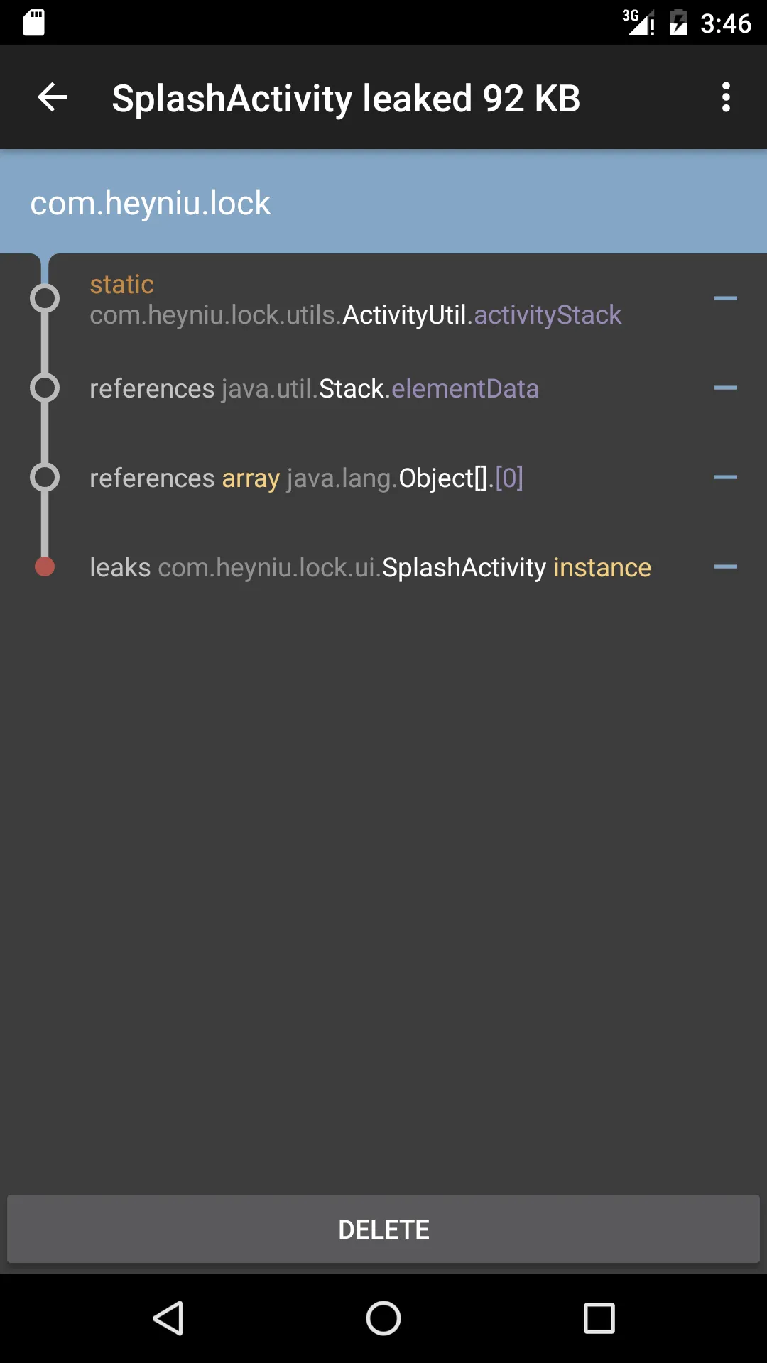 分析:通过截图我们发现 SplashActivity 被 ActivityUtil 的实例 activityStack 持有 引用代码: